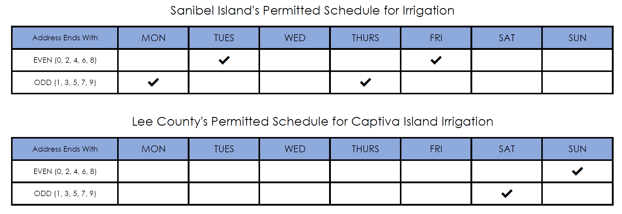 Due to recent public interest, please refer to our long-standing water restrictions which are governed by South Florida Water Management District. If conditions change, IWA will update the schedule, as needed. We ask our Members to follow the City of Sanibel and Lee County’s irrigation restrictions to protect this vital, natural resource. Allowed irrigation days are based on a property’s address as listed on the chart below. For more information on IWA & Coastal Watch’s Conservation Plan, please visit our water conservation page.